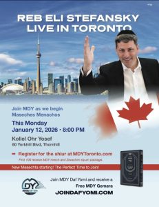 הרב אלי סטפנסקי פותח היום את מסכת מנחות בשידור חי מטורונטו הצטרפו ל-MDY עם תחילת מסכת מנחות הערב, יום שני 12 בינואר 2026 | 20:00